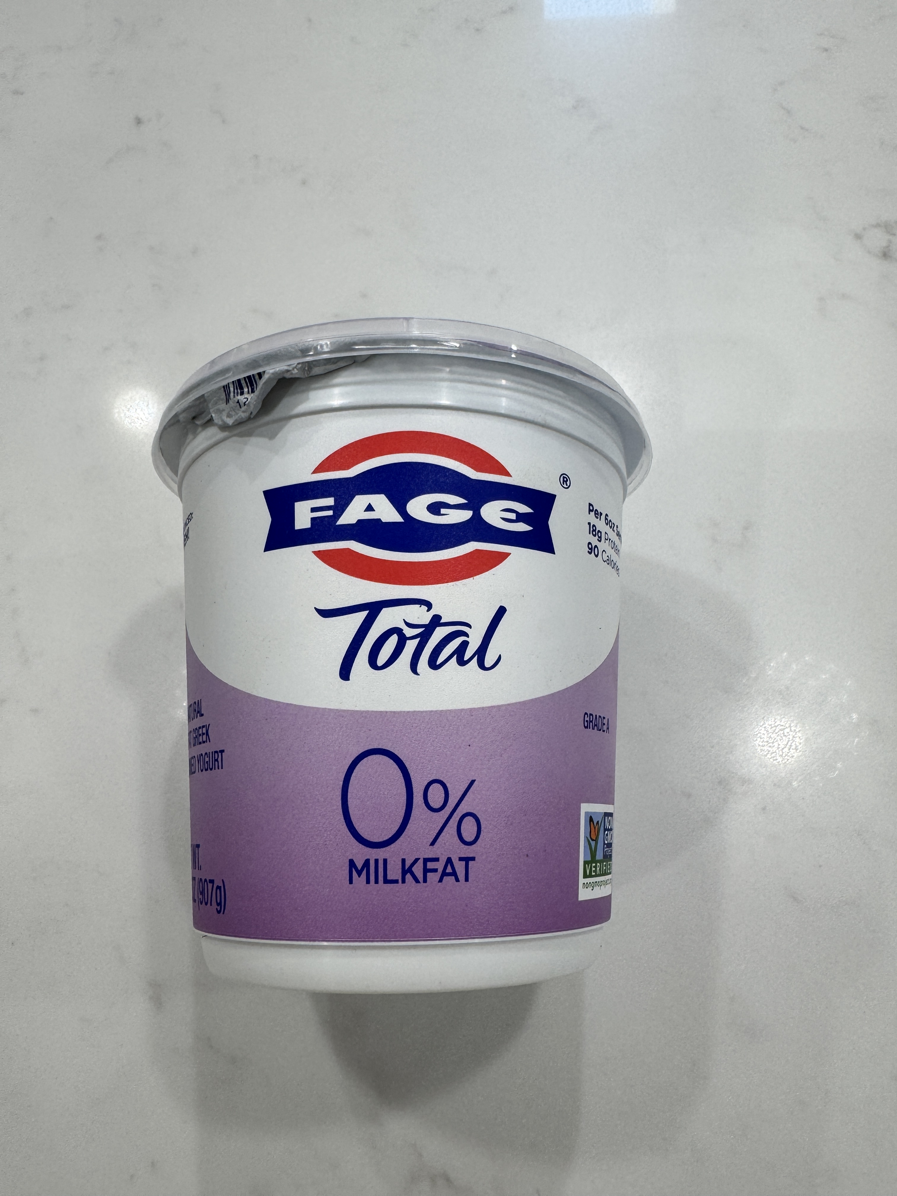 - Plain Greek Yogurt, 400 grams. I use Fage 0% fat yogurt, which has a very high protein to calorie ratio.