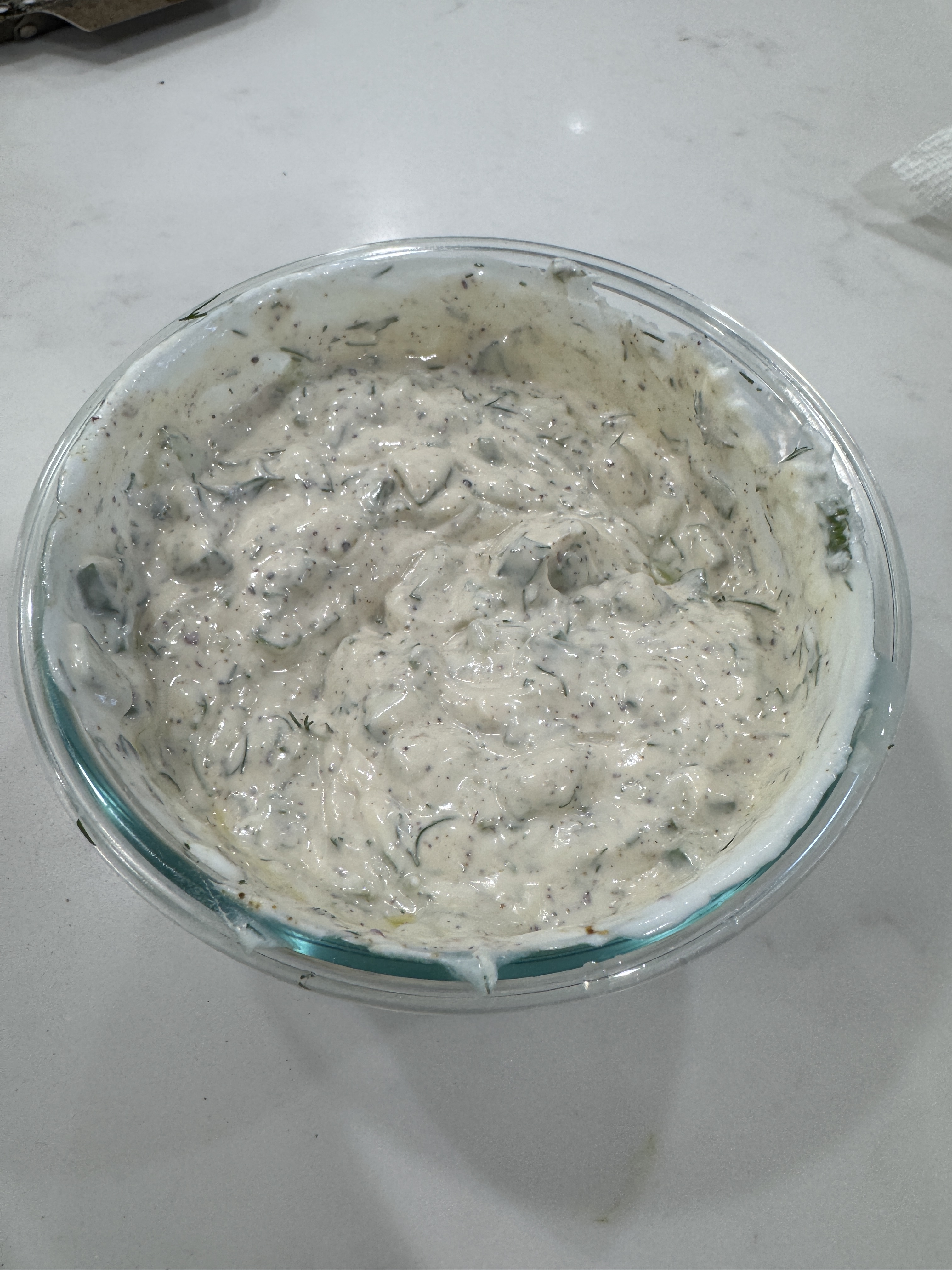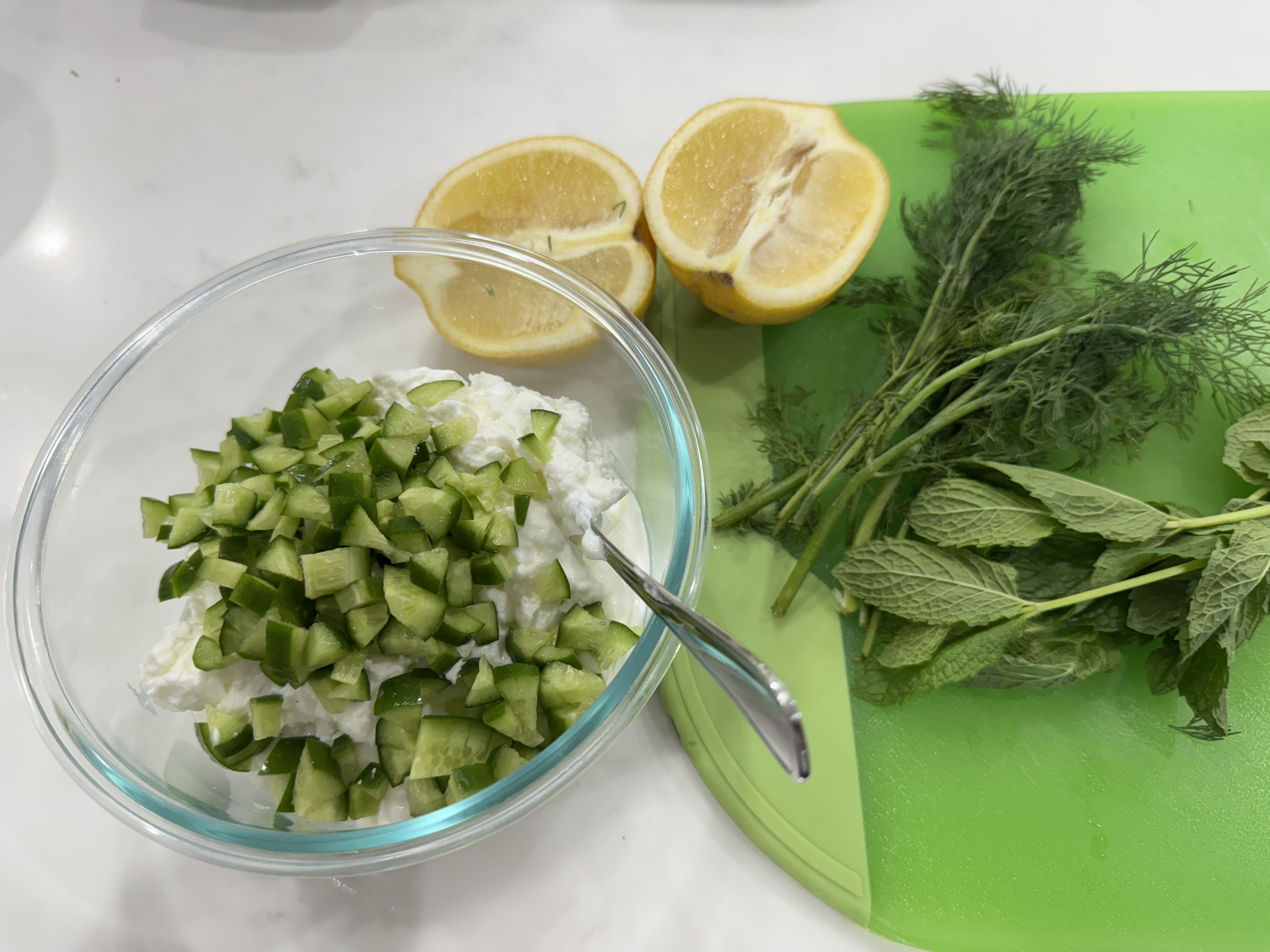 The basic ingredients are just plain Greek yogurt, lemon juice, dill, cucumbers, olive oil, and salt. Everything else is completely optional.