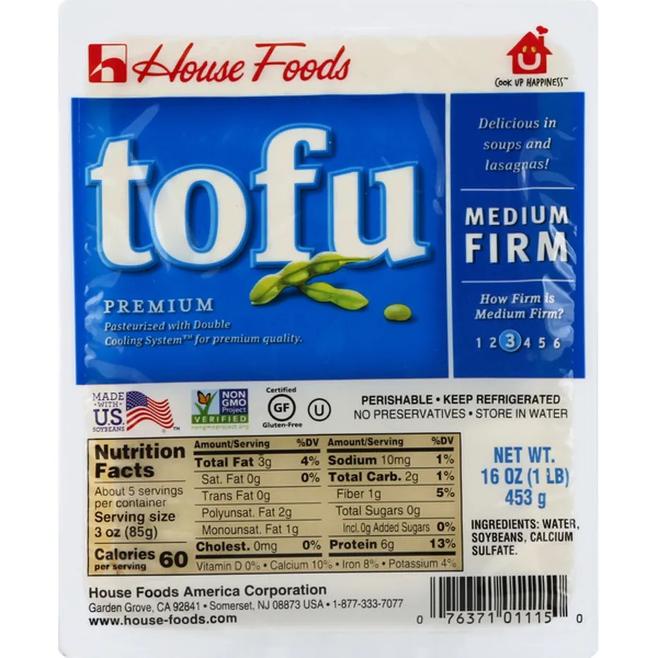 - Tofu, medium firm, one 14 oz package. I like using the House Foods brand, but I don’t think there’s a big difference between different tofu brands. I do like the medium firmness, however, because while stir frying the tofu, some of the pieces will inevitably break. I find that if you use the soft firmness, the tofu basically becomes a mess, whereas with medium, it’s a nice balance where most of the tofu stays in nice chunks.