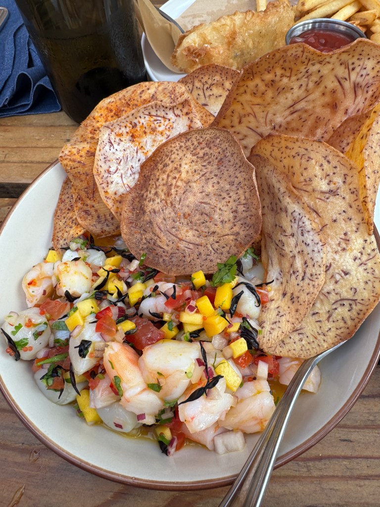- Bay Scallop and Tiger Shrimp Ceviche (mango salsa, hijiki, mango yuzu, spiced taro chips)