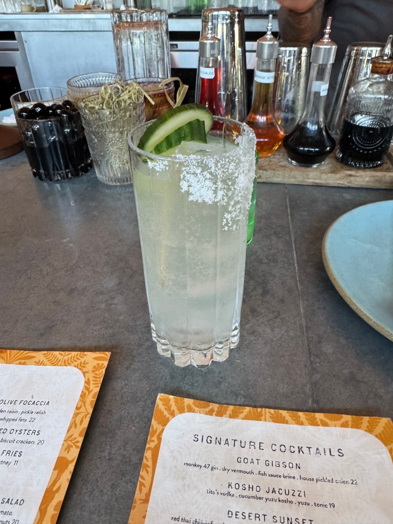 - Kosho Jacuzzi Cocktail (Tito’s handmade vodka, cucumber yuzu kosho, yuzu, Fever Tree tonic)