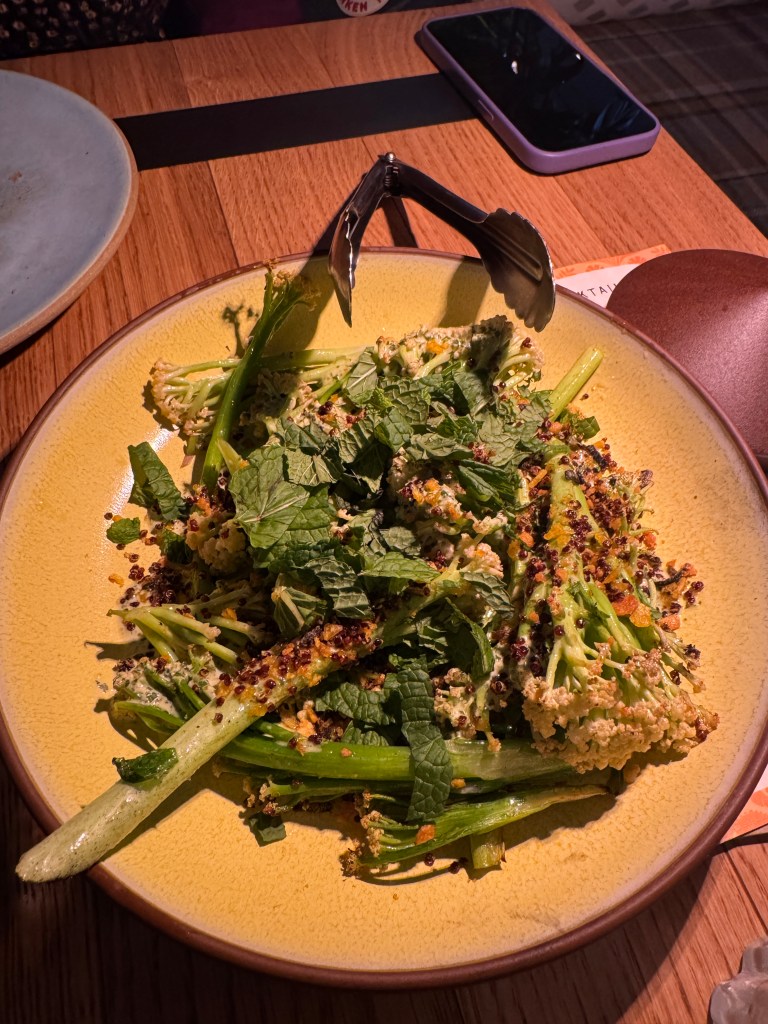 - Wood-fired Sprouted Cauliflower (limey huacatay, shio kombu crunch, mint)